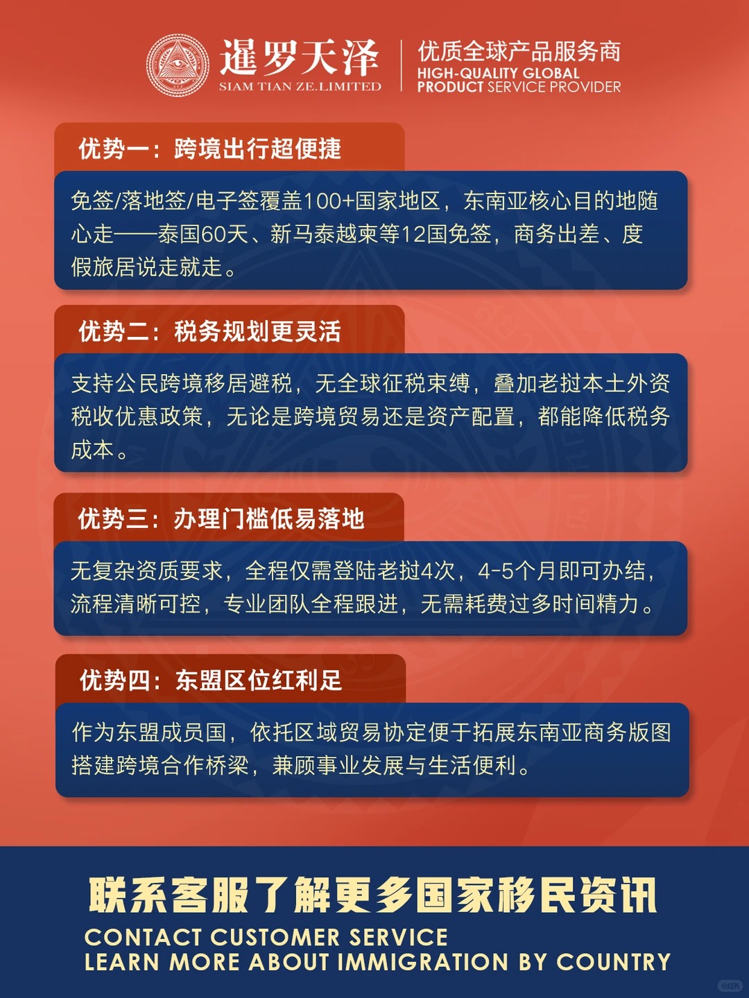 老挝护照|东南亚自由通行密钥,解锁“说走就走”的跨境生活 🧳 仅需4-5个月,即可手握老挝护照,畅行东南亚多国,轻松开启商务、旅行、居住多重可能!全程仅需登陆老挝4次,流程清晰可控,专业团队全程跟进,省心省力办妥所有手续。 老挝护照核心优势:出行、税务、门槛三重红利,解锁多元生活 1. 跨境出行超便捷:免签/落地签/电子签覆盖100+国家地区,东南亚核心目的地随心走——泰国60天、新马泰越柬等12国免签,商务出差、度假旅居说走就走。 2. 税务规划更灵活:支持公民跨境移居避税,无全球征税束缚,叠加老挝本土外资税收优惠政策,无论是跨境贸易还是资产配置,都能降低税务成本。 3. 办理门槛低易落地:无复杂资质要求,全程仅需登陆老挝4次,4-5个月即可办结,流程清晰可控,专业团队全程跟进,无需耗费过多时间精力。 4. 东盟区位红利足:作为东盟成员国,依托区域贸易协定,便于拓展东南亚商务版图,搭建跨境合作桥梁,兼顾事业发展与生活便利。